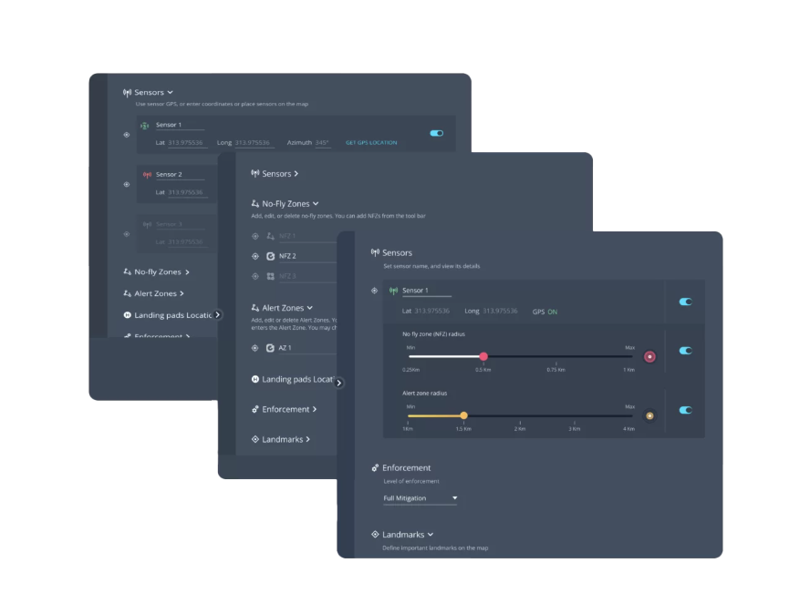 Todos los kits Sentrycs incluyen hardware estándar y software propietario. El kit fijo Sentrycs está diseñado para proteger permanentemente el cielo sobre perímetros estáticos, en cualquier entorno.